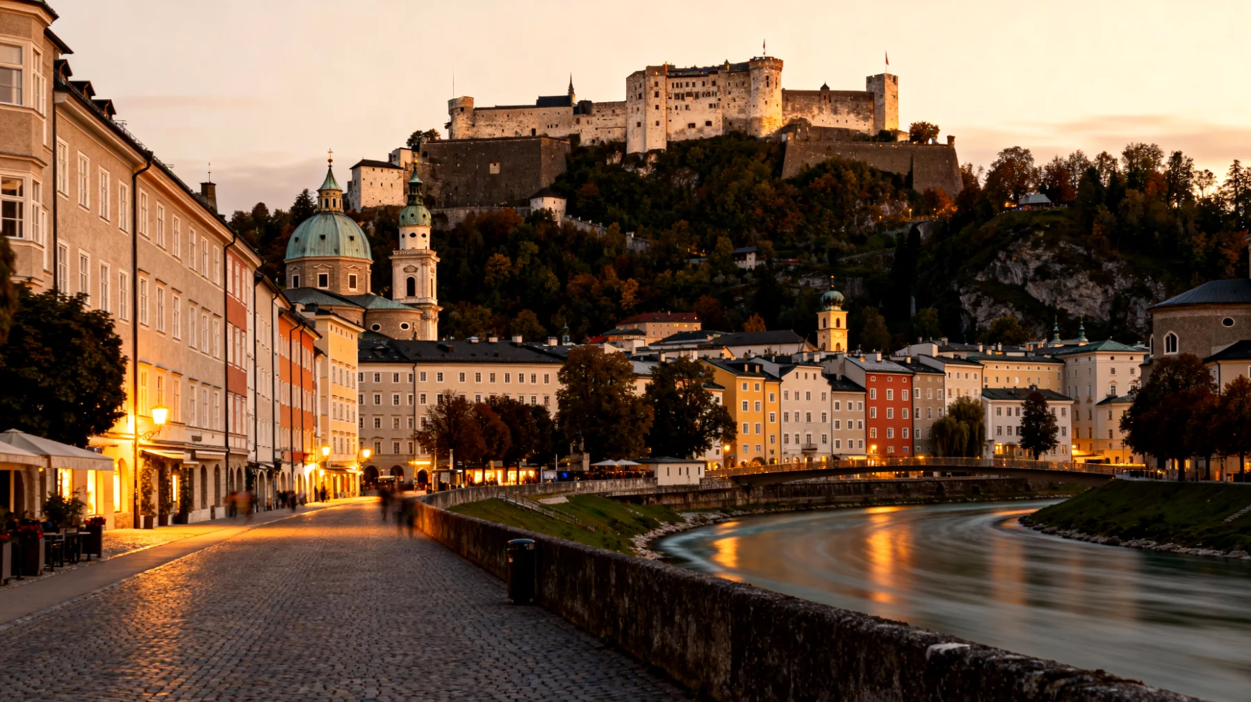 Una passeggiata lungo il fiume Salzach al tramonto, quando le luci si accendono sui palazzi della città vecchia, non costa nulla ma rimane impressa nella memoria. Il ponte Makartsteg, decorato con lucchetti dell’amore, offre il punto panoramico migliore per ammirare la fortezza illuminata che si staglia contro il cielo invernale.
